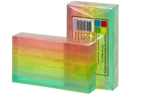 Нежное мыло с полупрозрачными цветовыми переходами, будто сложенное из нескольких кусочков, одновременно яркое и свежее, со сладким фруктово-ягодным ароматом и «конфетными» нотами.