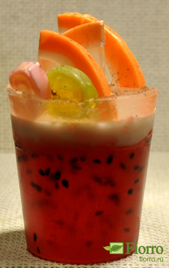 Мыло состоит из трех слоев. Первый слой - темно-красный прозрачный, внутри которого находятся зерна черного кунжута. Далее следует ароматизированный белый слой - взбитые сливки. Верх пирожного это прозрачный слой ароматного мыла, который украшен дольками лимонов и мармеладками разных цветов, посыпанными ароматным какао.