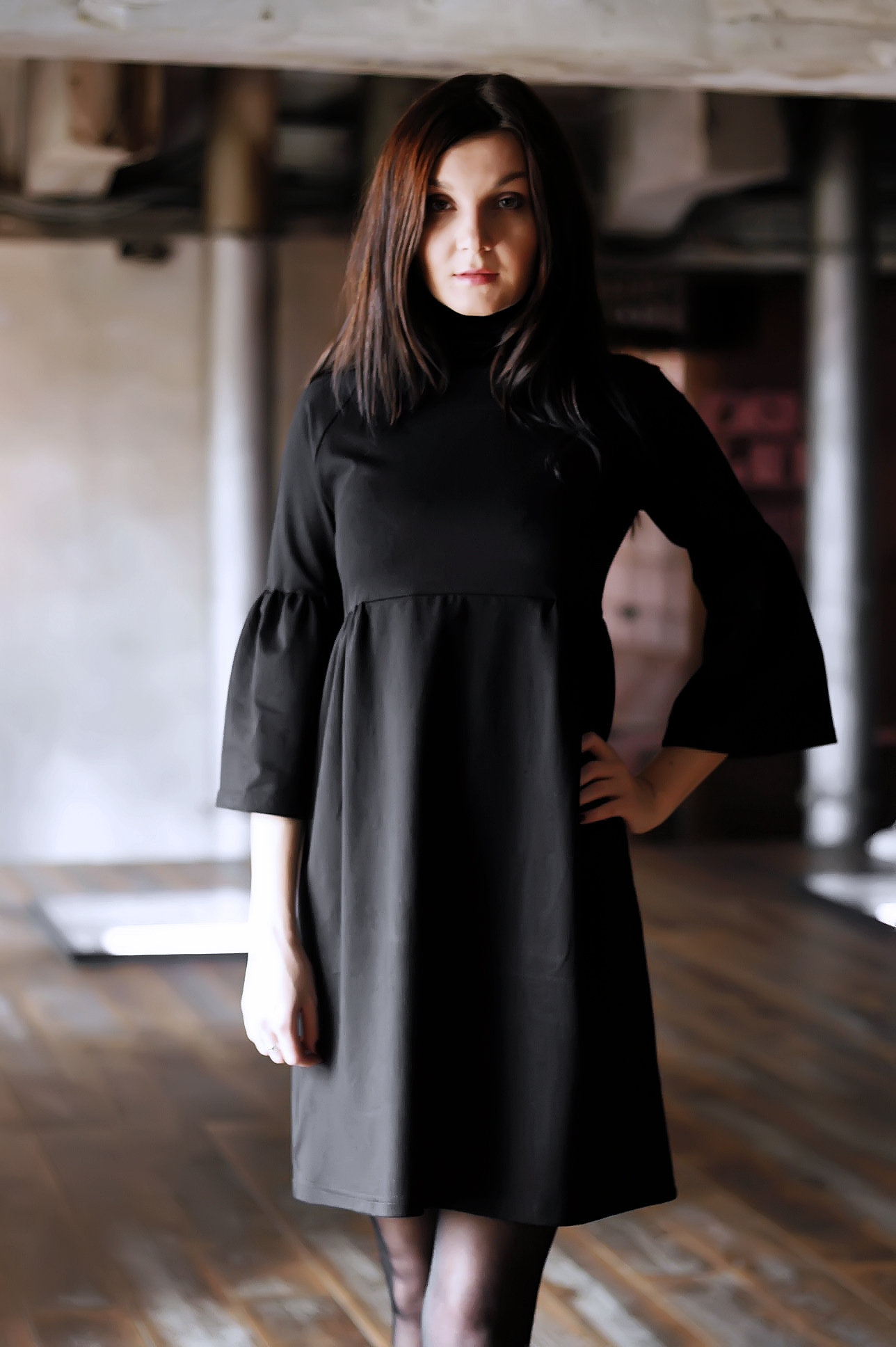 Модное трикотажное платье с объемным воротником и рукавами. Шов под грудью, от которого идут небольшие складки, придающие изделию объемную форму баллон. Длина 91 см., длина рук. 30см