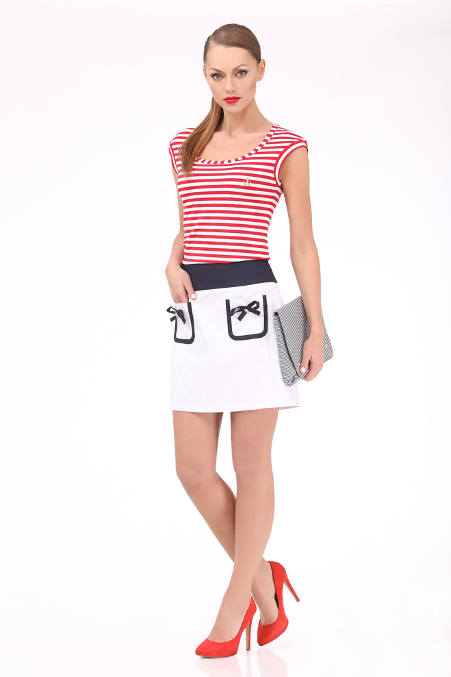 Эффектная мини-юбка из хлопка - контрастная кокетка, окантовка накладных карманов и бантики.