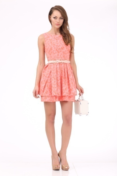 От талии заложены фигурные складки. Вырез горловины спинки фигурной формы. Талия подчеркнута тонким поясом.