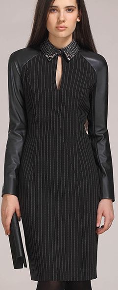 Прилегающее платье длиной до колена. Кокетки, воротник и рукава из кожи. Отложной воротник декорирован вышивкой и камнями.