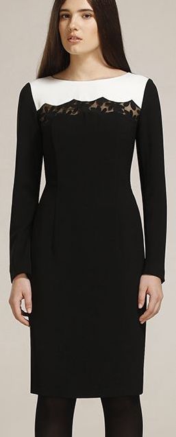Прилегающее платье длиной по колено. Фигурная кокетка со вставкой из вышитой органзы. Длинный рукав. Застежка на металлическую молнию по спинке.