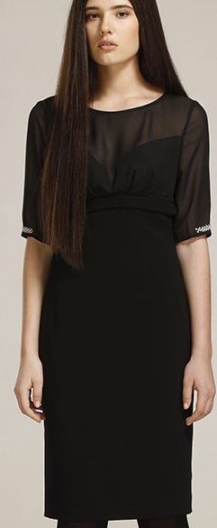 Полуприлегающее платье длиной до колен. Фигурный лиф. Кокетка и рукава из шифона. Декор жемчугом по низу рукавов. Трикотажная подкладка.