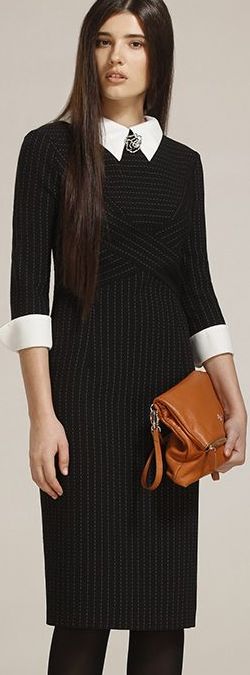 Полуприлегающее платье длиной до колен. Спереди фигурные подрезы. Застежка на молнию в боковом шве. Рукава длиной 3\4. Отложной воротник и манжеты.
