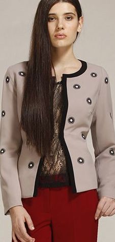 Полуприлегающий укороченный жакет. Контрастная отделка бортов и горловины. Длинный рукав. Декор: вышивка, жемчуг. Жаккардовая подкладка.