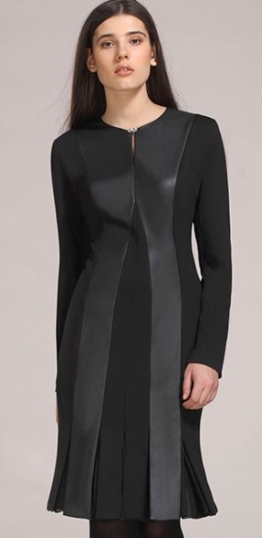 Прилегающее платье длиной до колена. Фигурные кожаные вставки по переду и спинке. Круглая горловина. Длинный рукавы. По низу складки со вставками из шифона. Съемный кожаный воротник декорированный камнями и металлом.