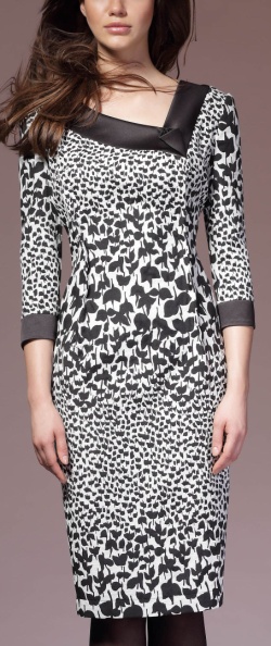 Полуприлегающее платье из жаккарда, длиной за колено. Рукав 3\4. Фигурный вырез горловины. Атласная отделка.