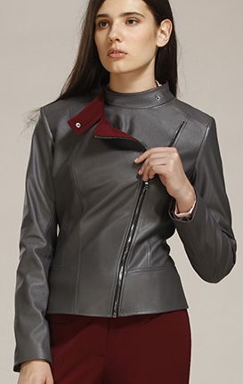 Куртка-косуха из кожи прилегающего силуэта. Застежка на металлическую молнию. Воротник-стойка. Подборта и воротник контрастного цвета. Длинный рукав.