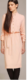 Полуприлегающее платье длиной за колено. Воротник-стойка. Накладные карманы. Золотые пуговицы. Съемный пояс. На трикотажной подкладке