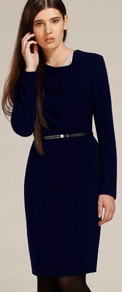 Прилегающее платье длиной выше колена. Спинка до талии и отворот горловины контрастного цвета. Длинный рукав. Кожаный ремешок.