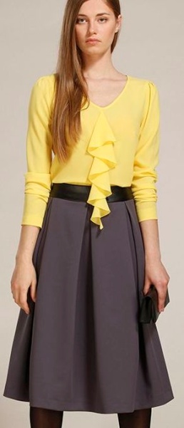 Расширенная юбка со складками длиной ниже колена. Кожаный пояс. Жаккардовая подкладка.