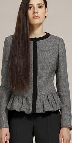 Укороченный полуприлегающий жакет с баской. Контрастная отделка по горловине и застежке. Длинный рукав. Жаккардовая подкладка.