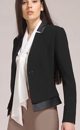 Полуприлегающий укороченный жакет. Застежка на одну пуговицу. Отделка воротника и низа кожей. Длинный рукав. Жаккардовая подкладка.
