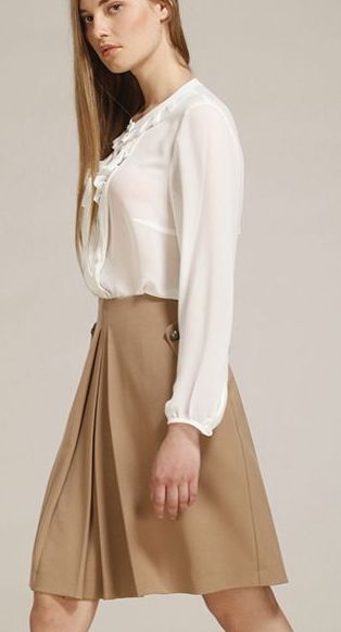 Юбка со складками длиной до колена. Диагональные клапаны с металлическими пуговицами. Жаккардовая подкладка.