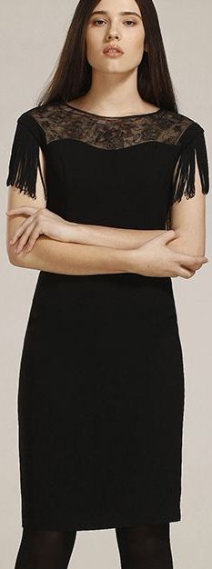Полуприлегающее платье длиной по колено. Полупрозрачная кокетка с вышивкой. Декоративный рукав с бахромой. Трикотажная подкладка.