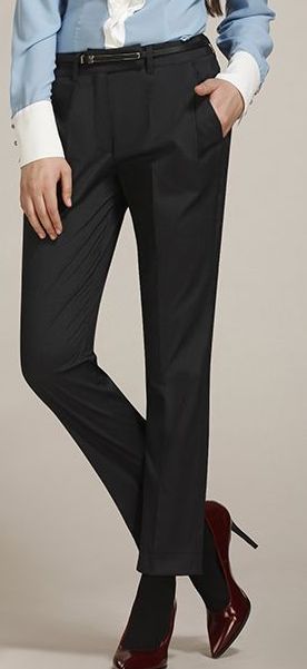 Прямые, слегка зауженные брюки со складками у пояса. Боковые карманы.