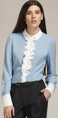 Полуприлегающая блузка. Контрастный воротник, планка с оборкой, манжеты. Длинный рукав.