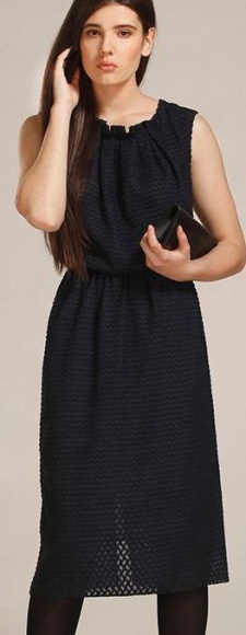 Свободное платье с открытой проймой длиной за колено. Горловина со складками, декор камнями. Трикотажная подкладка.