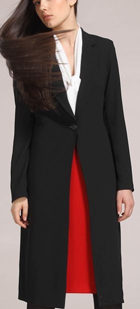 Приталенный кардиган длиной ниже колен. Пиджачный воротник с лацканами, застежка на 1 пуговицу. На спинке разрез. Длинный рукав. Внутренние швы окантованы атласной тесьмой.