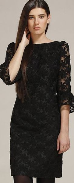 Полуприлегающее платье выше колен из вышитой органзы. Вырез лодочкой. Рукав длиной 3\4 с оборкой. Атласная подкладка.