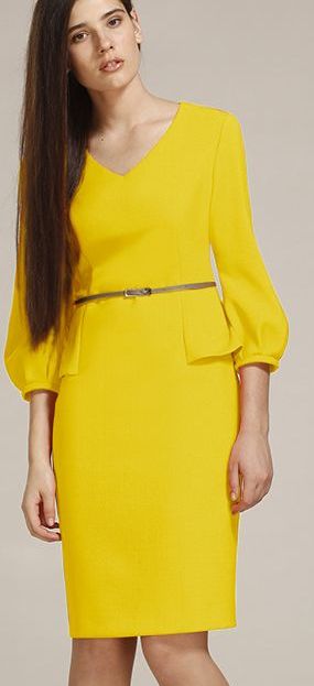 Прилегающее платье до колен. Боковая баска. Рукав с напуском длиной 3\4. Кожаный ремешок. Трикотажная подкладка.